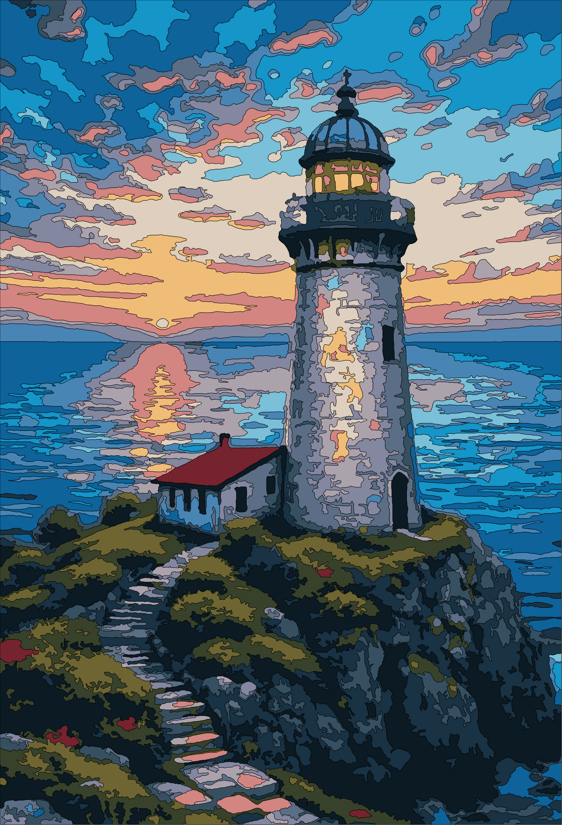 Let your brush guide you along the winding path to the Beacon of Dusk, where twilight meets tranquility. This breathtaking seascape features a solitary lighthouse standing tall against a dreamy, pastel-drenched sky. The sunset spills across the ocean in ripples of gold, blush, and lavender, casting a warm glow over the rugged cliffs and weathered stones below. With every stroke, you’ll bring to life a scene that whispers of guidance, hope, and the quiet magic of coastal evenings.